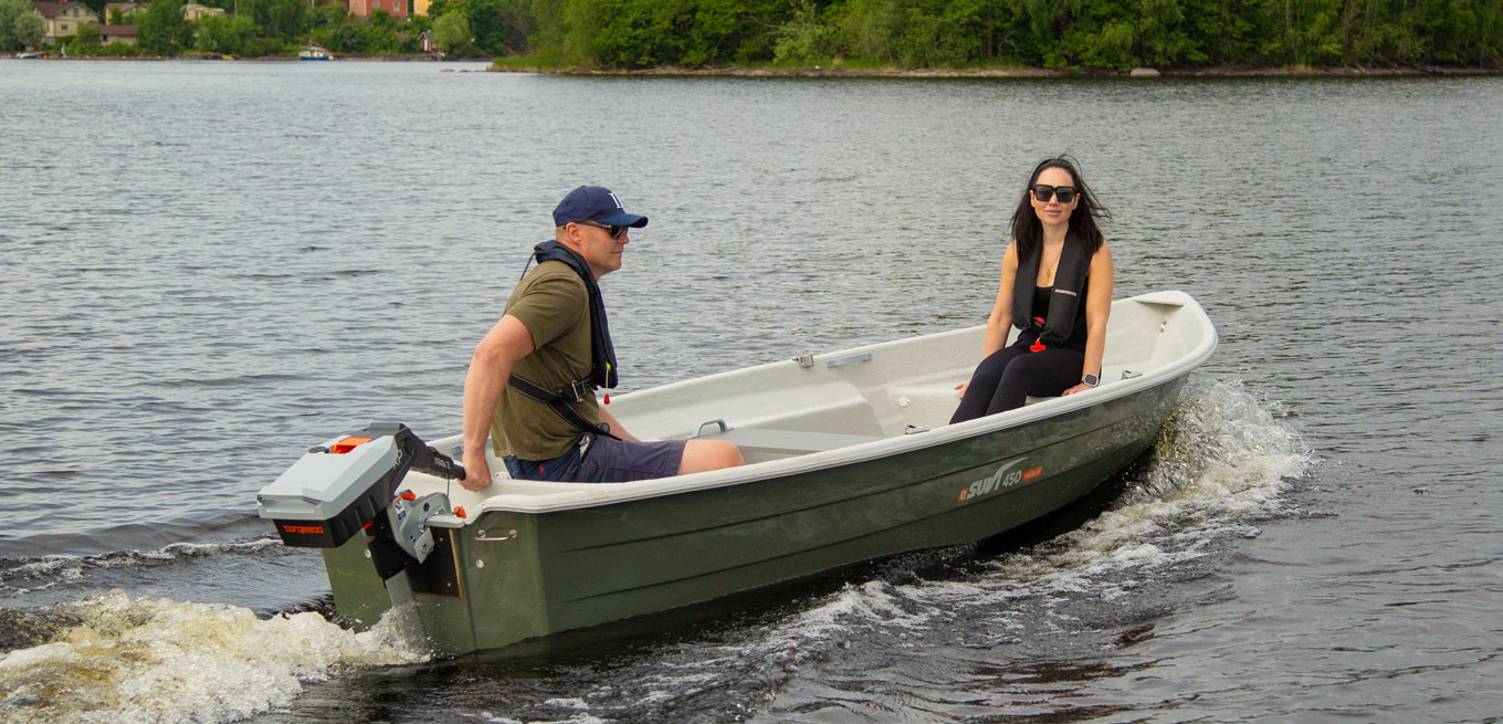 eSuvi 450 är en regnvattendränerande rodd-motorbåt för stug- och fiskebruk. Båten är lätt att förvara flytande till exempel vid en brygga tack vare regnvattendräneringen. Med samma skrov har båten samma goda rodd- och köregenskaper som eSuvi 444-modellen. Den löstagbara mittbänken och den jämna golvytan gör det lättare att röra sig i båten och transportera varor. Två låsbara förvaringsutrymmen.