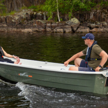 eSuvi 450 är en regnvattendränerande rodd-motorbåt för stug- och fiskebruk. Båten är lätt att förvara flytande till exempel vid en brygga tack vare regnvattendräneringen. Med samma skrov har båten samma goda rodd- och köregenskaper som eSuvi 444-modellen. Den löstagbara mittbänken och den jämna golvytan gör det lättare att röra sig i båten och transportera varor. Två låsbara förvaringsutrymmen.